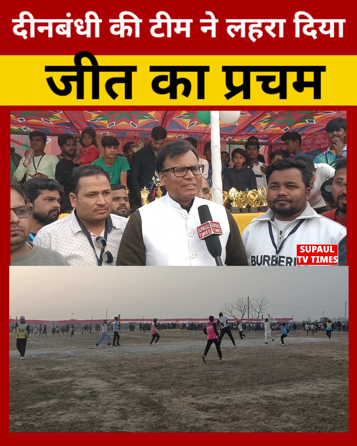 ख़बर सुपौल जिले छातापुर विधानसभा के दीनबंधी पंचायत से है, आज दीनबंधी पंचायत में टूर्नामेंट का फाइनल मुकाबला खेला गया जिसमें दीनबंधी पंचायत की टीम ने शानदार जीत दर्ज की है, बता दें के पिछले कुछ दिनों से दीनबंधी पंचायत में एक शानदार क्रिकेट टूर्नामेंट चल रहा था जिसका आज फाइनल मुकाबला खेला जा रहा था, आज फाइनल में करजाइन और दीनबंधी की टीम आमने सामने थी, खेल बहुत ही अच्छा हुआ, दीनबंधी की टीम ने टॉस जीतकर पहले बैटिंग करने का फैसला लिया, दीनबंधी की सारे विकेट खो कर 20 वॉवर में 179 रन बनाए जिसके जवाब में करजाइन टीम 20 vover खेल कर सारे विकेट खो कर 120 रन ही बना सकी,