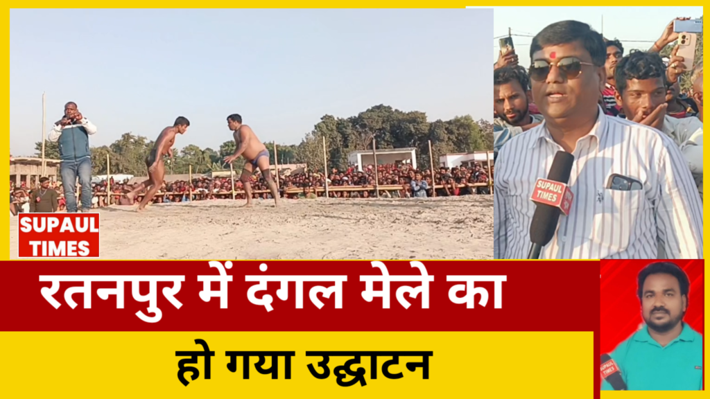 रतनपुर में 17 दिसंबर को जिस मेले का उद्घाटन हुआ था आज उसमें दंगल का भी उद्घाटन हो गया, रतनपुर के मैदान में आज पूरे भारत से बड़ी तादाद में पहलवान आए, पहलवानों को देखने के लिए पूरे सुपौल से लोगों का एक भीड़ उमड़ आया, बता दें कि लगातार तीन दिन तक दंगल का खेल चलेगा, इस दंगल में महिला और पुरुष दोनों पहलवान अपनी कुश्ती से लोगों को अपनी तरफ रिझाने की भरपूर कोशिश कर रहे हैं, आज रतनपुर के मुखिया संतोष कुमार मेहता ने अपने हाथों से दंगल मेले का फीता काटकर उद्घाटन किया, जैसे ही दंगल का खेल शुरू हुआ देखते ही देखते लाखों की तादाद में वहां भीड़ उमड़ पाड़ा, पहलवानों के दरमियान कुश्ती इतना जबरदस्त था कि लोगों को संभालना मुश्किल हो रहा था,